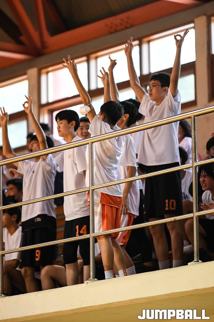 3일 양천구에 위치한 양정고등학교 체육관에서 열린 2022 한국중고농구 주말리그 양정고와 휘문고의 경기, 양정고 응원단이 승리를 확신하며 환호하고 있다. [점프볼=유용우 기자]