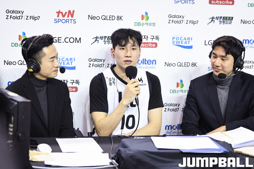 수원 KT가 서울 삼성과의 2025-2026 LG전자 프로농구 정규시즌 원정경기에서 78-71로 승리한 24일 잠실체육관. 선발로 나선 문성곤은 16분 14초 동안 7점 8리바운드 1스틸을 기록, KT의 역전승에 기여하며 중계방송사 수훈선수 인터뷰에 임했다.