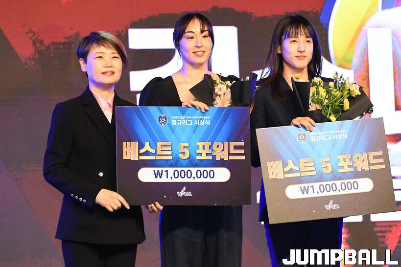 6일 여의도 63컨벤션센터 그랜드볼룸에서 열린 신한은행 SOL 2022-2023 여자프로농구 정규리그 시상식, 신한은행 김단비와 우리은행 김소니아가 베스트 5 포워드상 기념 촬영을 하고 있다.