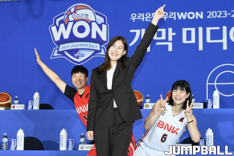 [점프볼=청담/박상혁 기자] 30일 청담 리베라호텔 베르사이유홀에서 열린 우리은행 우리WON 2023-2024 여자프로농구 개막미디어데이, 부산 BNK썸 박정은 감독과 진안, 이소희가 사진 촬영을 위해 포즈를 취하고 있다.