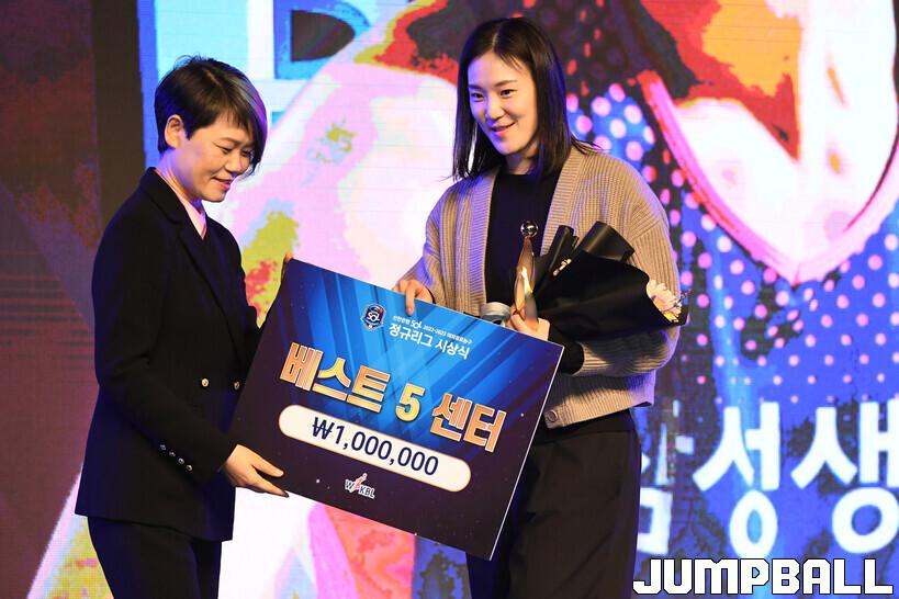6일 여의도 63컨벤션센터 그랜드볼룸에서 열린 신한은행 SOL 2022-2023 여자프로농구 정규리그 시상식, 삼성생명 배혜윤이 베스트 5 센터상을 받고 있다.