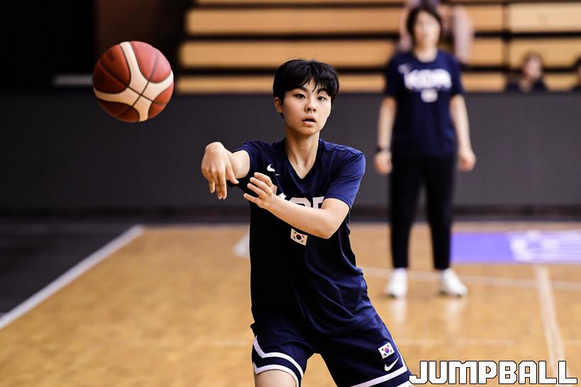 U17 여자농구대표팀 조민하가 패턴 훈련을 위해 패스를 시도하고 있다.