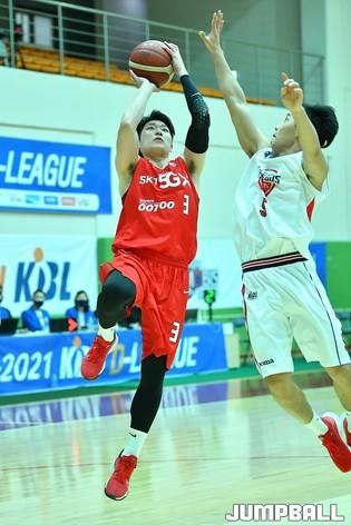 [점프볼=이천/유용우 기자] 16일 이천 LG 챔피언스파크에서 열린 2020-2021 KBL D-리그 2차 대회 현대모비스와 SK의 경기, SK 배병준이 골밑 공격을 시도하고 있다.
