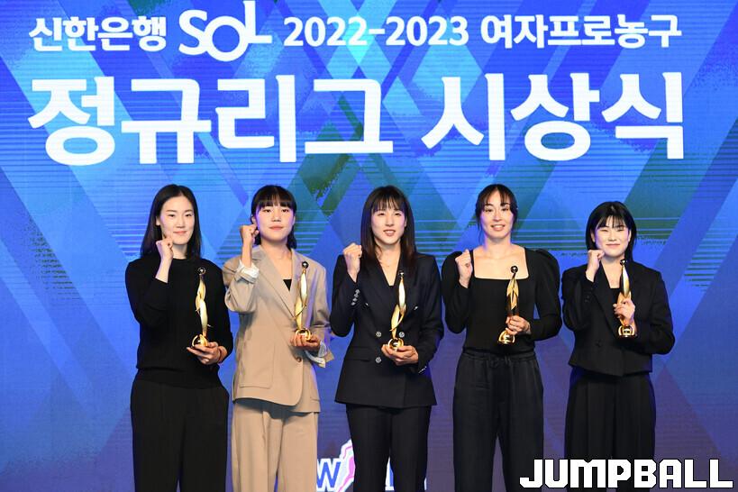 6일 여의도 63컨벤션센터 그랜드볼룸에서 열린 신한은행 SOL 2022-2023 여자프로농구 정규리그 시상식, 베스트 5상을 수상한 삼성생명 배혜윤, 우리은행 박지현, 김단비, 신한은행 김소니아, BNK썸 이소희가 포즈를 취하고 있다.