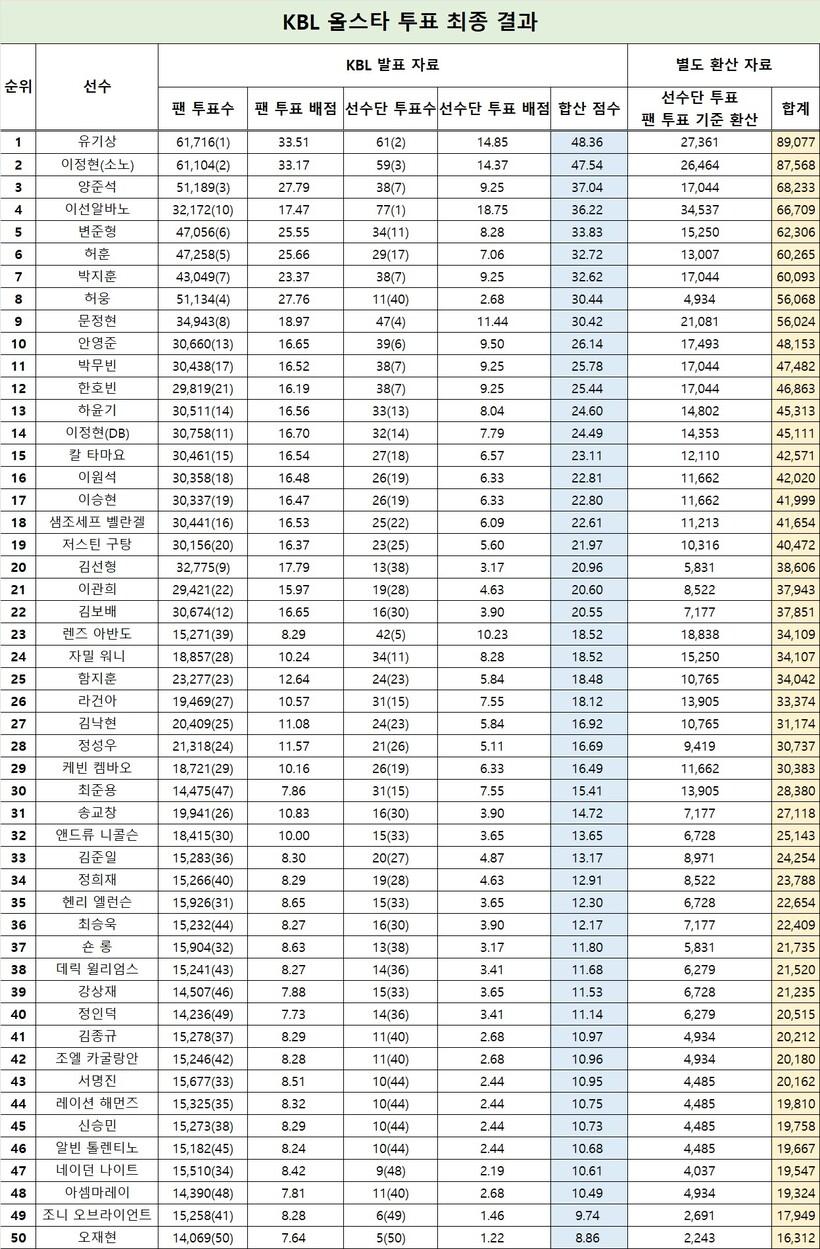 KBL은 18일 올스타 투표 결과를 발표했다. 지난 시즌부터 올스타 투표는 팬과 선수 투표로 진행된다. 비율은 7대 3으로 팬 투표에 더 많은 비중을 둔다.