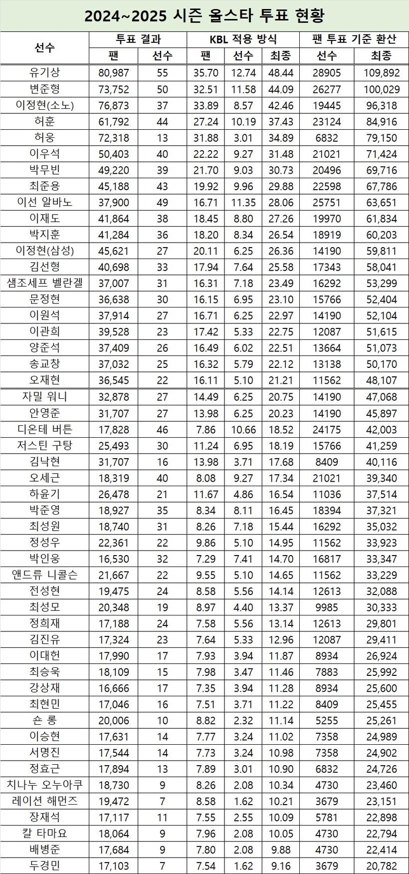 KBL은 지난 18일 올스타 후보 50명의 투표 결과를 모두 공개했다.