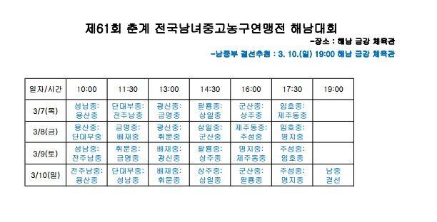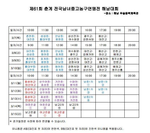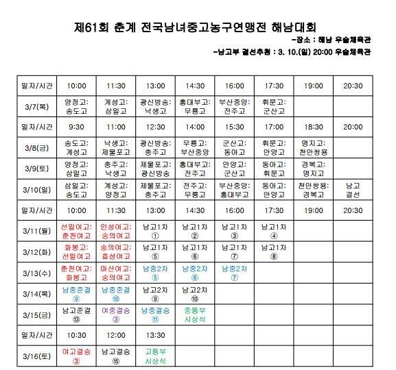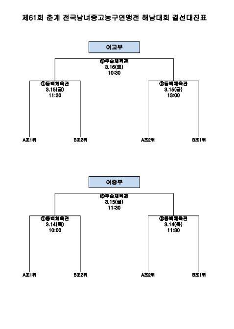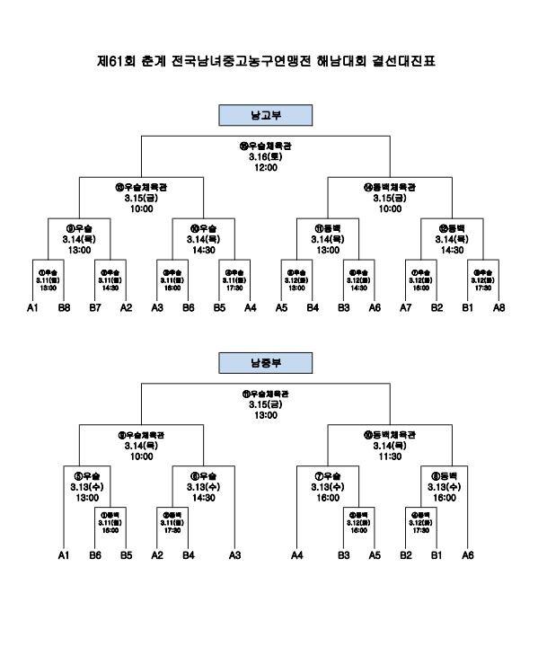 28일 한국중고농구연맹(회장 박소흠)은 전라남도 해남군에서 열릴 '제61회 춘계 전국남녀중고농구연맹전 해남대회' 대진표를 발표했다.