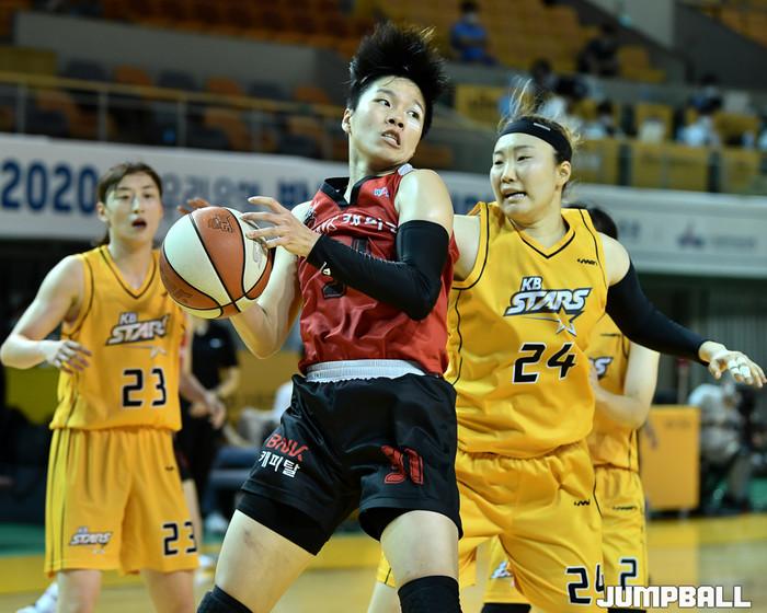 [점프볼=청주/유용우 기자]  21일 청주체육관에서 열린 '2020 우리은행 박신자컵 서머리그' KB와 BNK썸의 3-4위 결정전, BNK썸 진안이 리바운드를 잡고 있다.