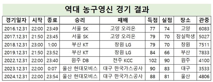 지난 7차례 농구영신에서 가장 적은 점수 차는 2016년 서울 SK와 고양 오리온의 맞대결에서 나온 3점 차(77-74)다.