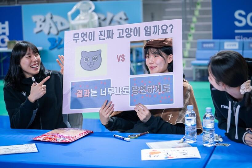 특히 포스트잇 중 하나는 우승 공약에 관한 질문이었다. 질문지를 본 선수들은 “우승하면 팬들과 에버랜드에 가고 싶다”라며 의지를 보였고, 이어 삼성생명 구단 관계자도 ‘엄지 척’ 사인으로 응답하며 화기애애한 분위기를 자아냈다.