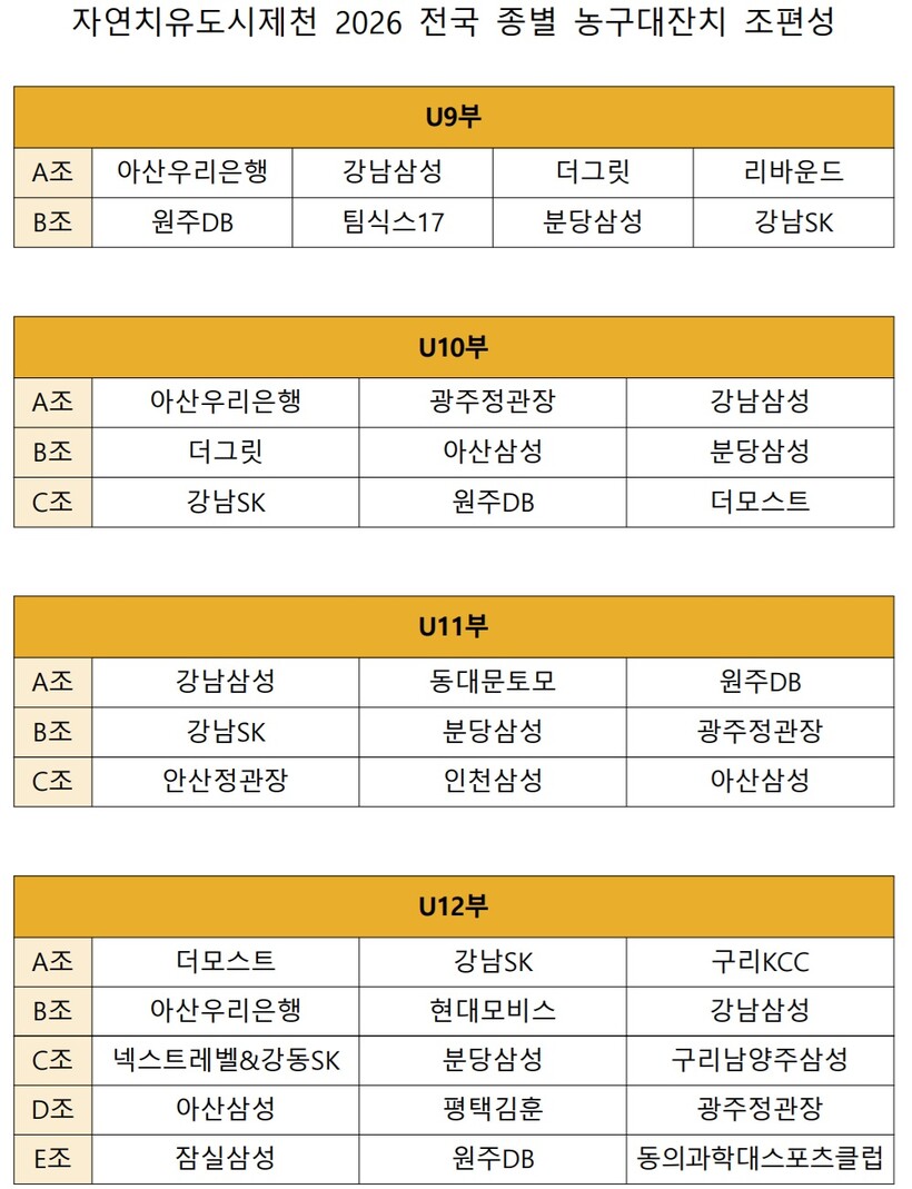 큰 관심 속에 생활체육 농구대회의 품격을 높이기 위해 다양한 시도를 꾀하고 있는 자연치유도시 제천 2026 전국 종별 농구대잔치는 2월7일부터 12일까지 6일 간 제천 체육관, 명지국민체육센터, 세명대학교 체육관, 세명고등학교 체육관, 홍광초등학교 체육관 등 5개소에서 펼쳐지며 제천시, 제천시체육회, 제천시의회, 하나은행, 프로스펙스, 아이에스동서 등의 후원, 협찬으로 진행된다.