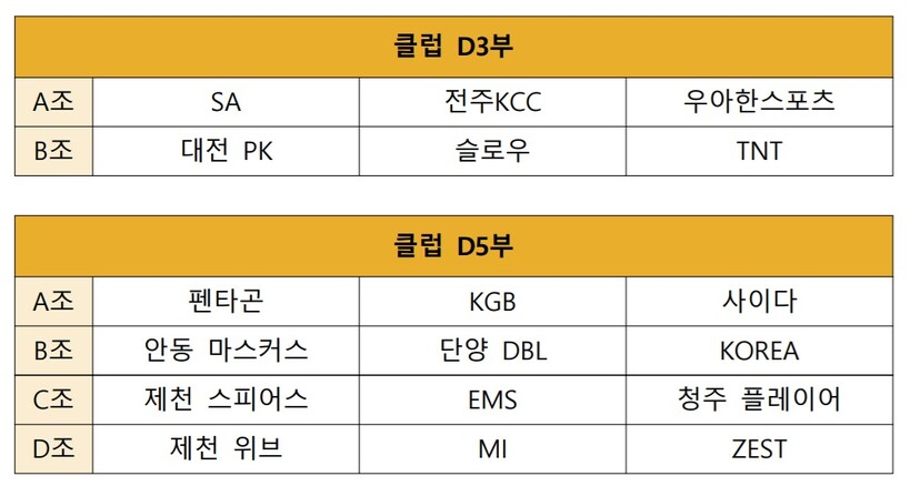 아울러 지난 해에는 개최되지 않았던 성인부가 2년 만에 부활했다. 성인부는 클럽D3, 클럽D5 2개 종별이 열리며, SA, 우아한스포츠, 슬로우와 같은 동호회 강호들을 비롯해 제천 스피어스, 제천 위브 등 제천 관내 동호회 팀들도 참가를 알렸다.