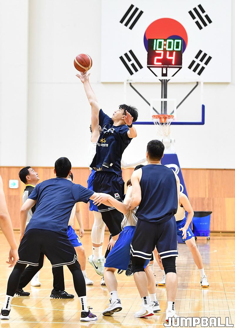 추일승 감독이 이끄는 남자농구대표팀은 오는 7월 12일부터 24일까지 인도네시아 자카르타에서 열리는 2022 FIBA 남자농구 아시아컵에 출전한다. 30일 진천국가대표선수촌 열린 단국대와의 연습경기에서 김종규가 경기시작 점프볼을 선점하고 있다.