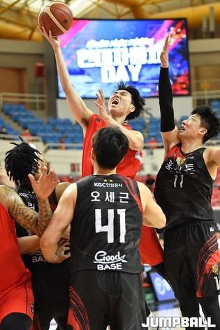 [점프볼=울산/유용우 기자] 24일 울산 동천체육관에서 열린 2020-2021 현대모비스 프로농구 울산 현대모비스와 안양 KGC인삼공사의 4강 플레이오프 2차전, 현대모비스 서명진의 슛을 KGC 문성곤이 블록을 저지하고 있다.