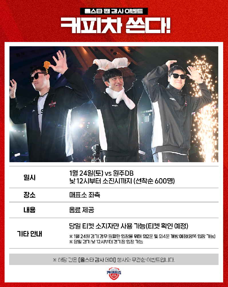 이번 커피차는 올스타에 선정된 세 명의 선수가 팬의 성원에 보답하기 위해 마련한 자리로 선착순 600명의 팬에게 커피차 음료를 제공한다.