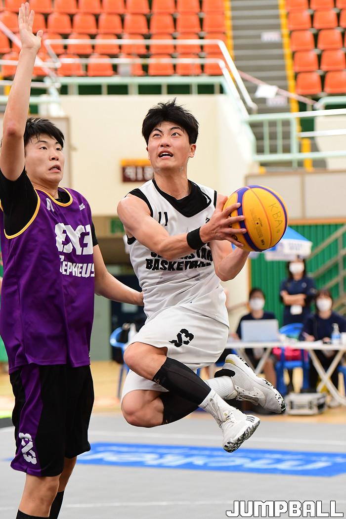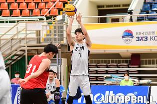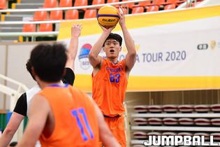 [점프볼=양산/박상혁 기자] 26일 양산실내체육관에서 열린 'KB국민은행 LiiV 3X3 코리아투어 2020 양산대회' 2일차 경기, 고등부 농알못이 슛을 시도하고 있다.