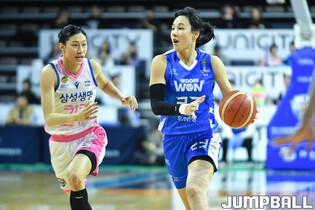 [점프볼=아산/유용우 기자] 10일 아산 이순신체육관에서 열린 우리은행 우리WON 2023-2024 여자프로농구 아산 우리은행과 용인 삼성생명의 플레이오프 1차전 경기, 우리은행 박지현이 드리블을 치며 공격을 작전을 지시하고 있다.