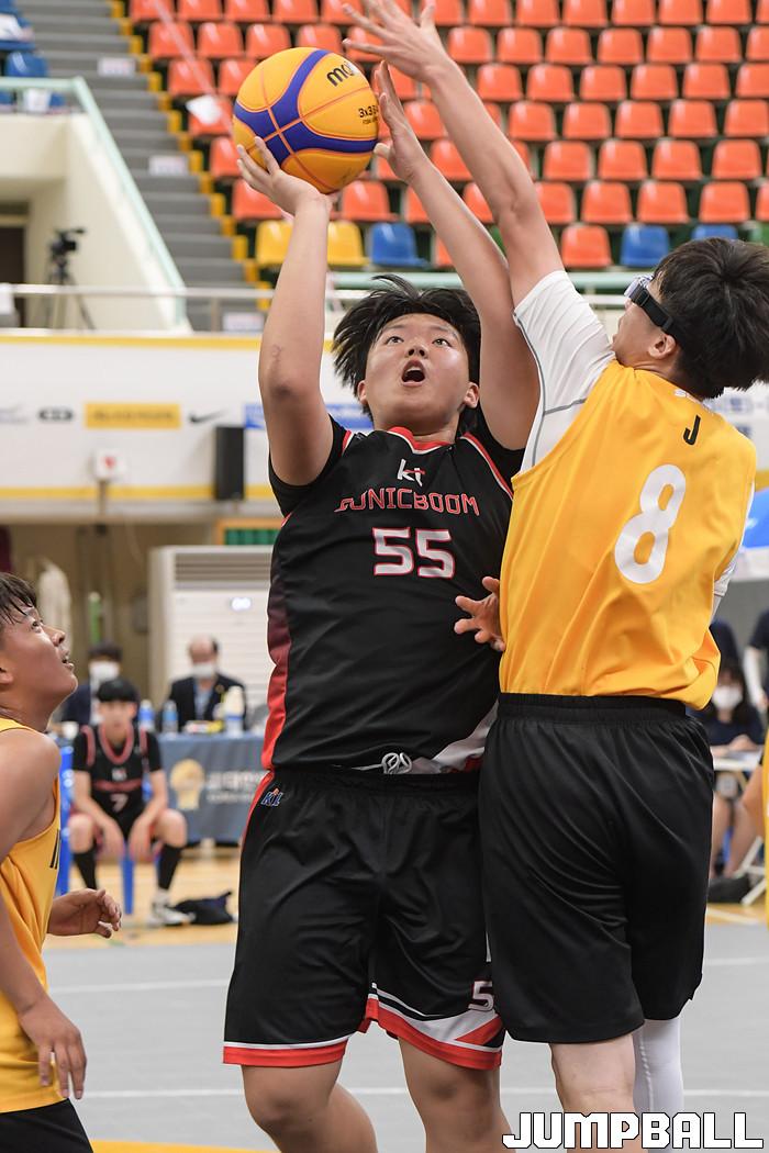 [점프볼=양산/박상혁 기자] 25일 양산실내체육관에서 열린 ' KBA 2020 코리아투어 양산대회' 1일차 경기, 중등부 KT가 수비를 앞에두고 슛을 시도하고 있다.