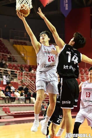 [점프볼=용인/박상혁 기자] 1일 경희대학교 국제캠퍼스 선승관에서 열린 2025-2026 KBL D리그 안양 정관장과 수원 KT의 3,4위전 경기, 정관장 주현우가 직접 던진 슛을 리바운드 해 슛으로 연결 시키고 있다.