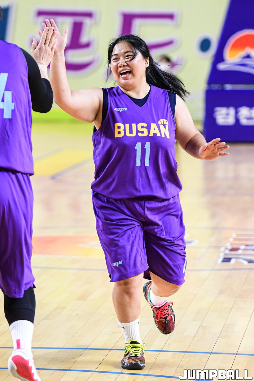 22일 김천실내체육관에서 열린 2022 전국실업농구연맹전 겸 제 41회 어머니 농구대회 숭의와 부산의 경기, 부산이 환호하고 있다.