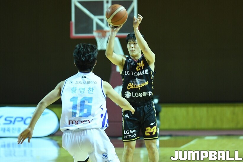 [점프볼=용인/유용우 기자] 18일 경희대 국제캠퍼스 선승관에서 열린 2025-2026 KBL D리그 창원 LG와 서울 삼성의 경기, LG 김선우가 상대방 수비를 피해 3점슛을 시도하고 있다.