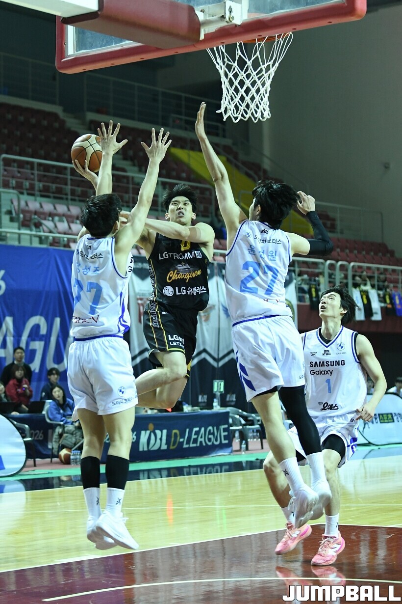 [점프볼=용인/유용우 기자] 18일 경희대 국제캠퍼스 선승관에서 열린 2025-2026 KBL D리그 창원 LG와 서울 삼성의 경기, LG 김종호가 상대방 진영으로 돌파하며 공격을 시도하고 있다.