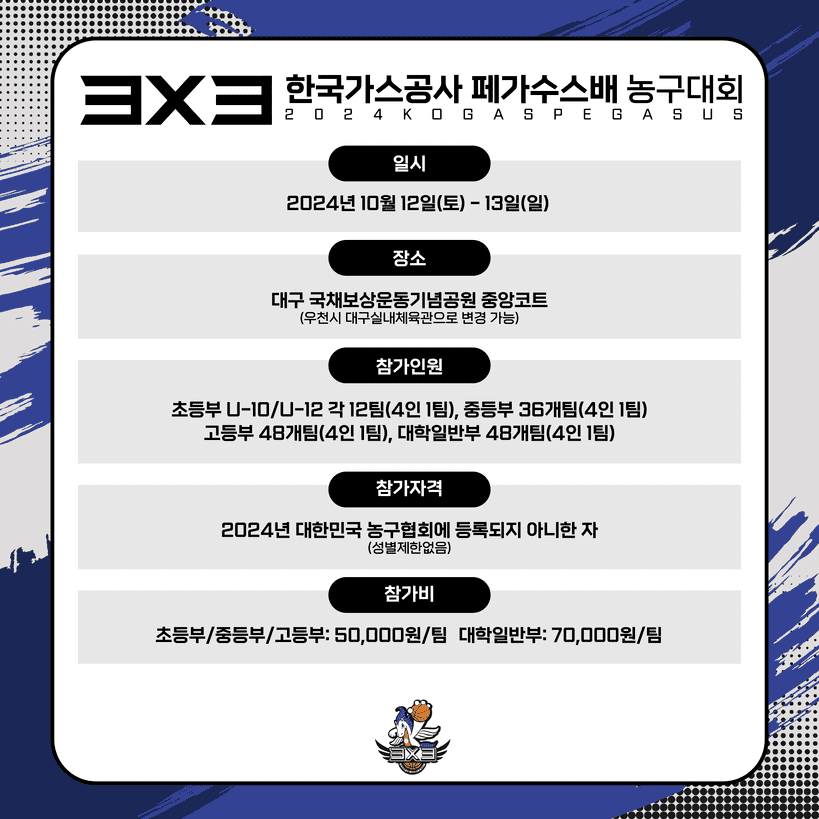 대구 한국가스공사는 2일 보도자료를 통해 "오는 10월 12~13일 이틀 간 오전 9시부터 대구시 국채보상운동기념공원 중앙코트에서 ‘제1회 페가수스배 3x3 농구대회’를 개최한다"고 밝혔다.
