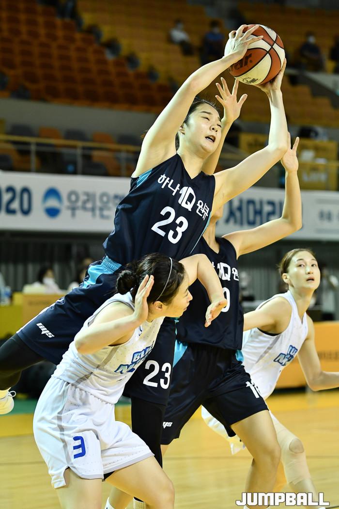 [점프볼=청주/유용우 기자]  21일 청주체육관에서 열린 '2020 우리은행 박신자컵 서머리그' 하나원큐와 삼성생명의 결승전, 하나원큐 이하은이 리바운드를 잡고 있다.
