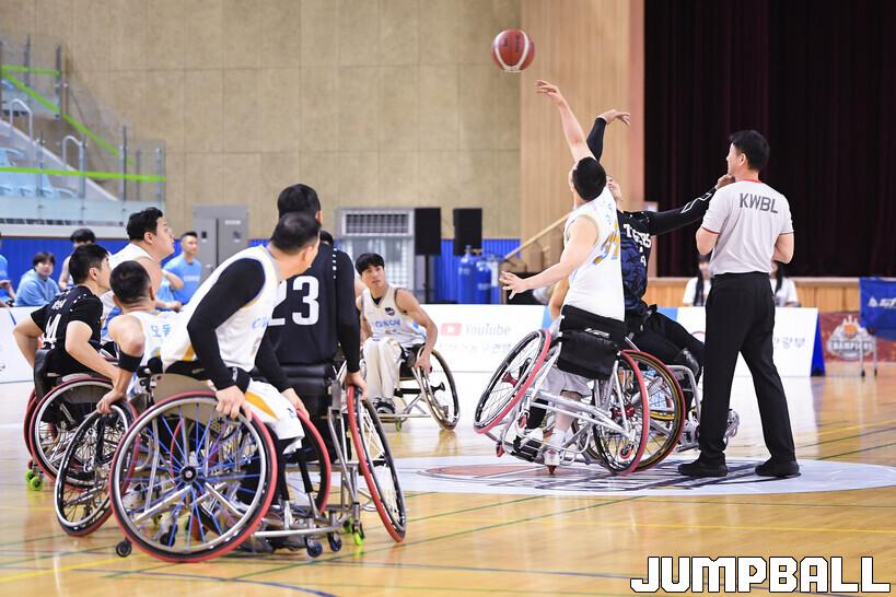 [점프볼=남양주/유용우 기자] 4일 남양주체육문화센터에서 열린 2025 KWBL 휠체어농구리그 코웨이블루휠스와 춘천타이거즈의 챔피언결정전 3차전, 우승을 가르는 마지막 경기가 점프볼로 시작되고 있다.