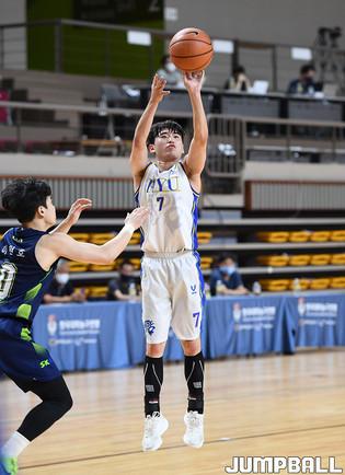 27일 경북 상주실내체육관에서 열린 제37회 MBC배 전국대학농구 상주대회 준결승전으로 성균관대와 한양대의 경기, 성균관대 김수환이 골밑에서 볼을 밖으로 쳐내고 있다.
