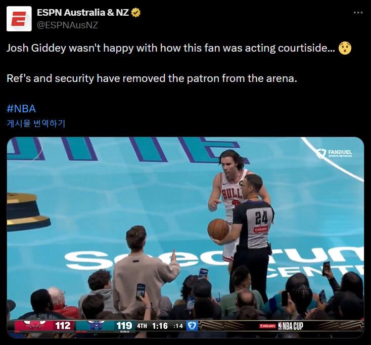 불미스러운 일은 29일 시카고 불스와 샬럿 호네츠의 맞대결이 열렸던 스펙트럼 센터에서 벌어졌다. 시카고가 112-119로 뒤진 경기 종료 1분 16초 전. 플로어석에 있었던 남성 관중은 기디를 향한 조롱을 퍼부었다.