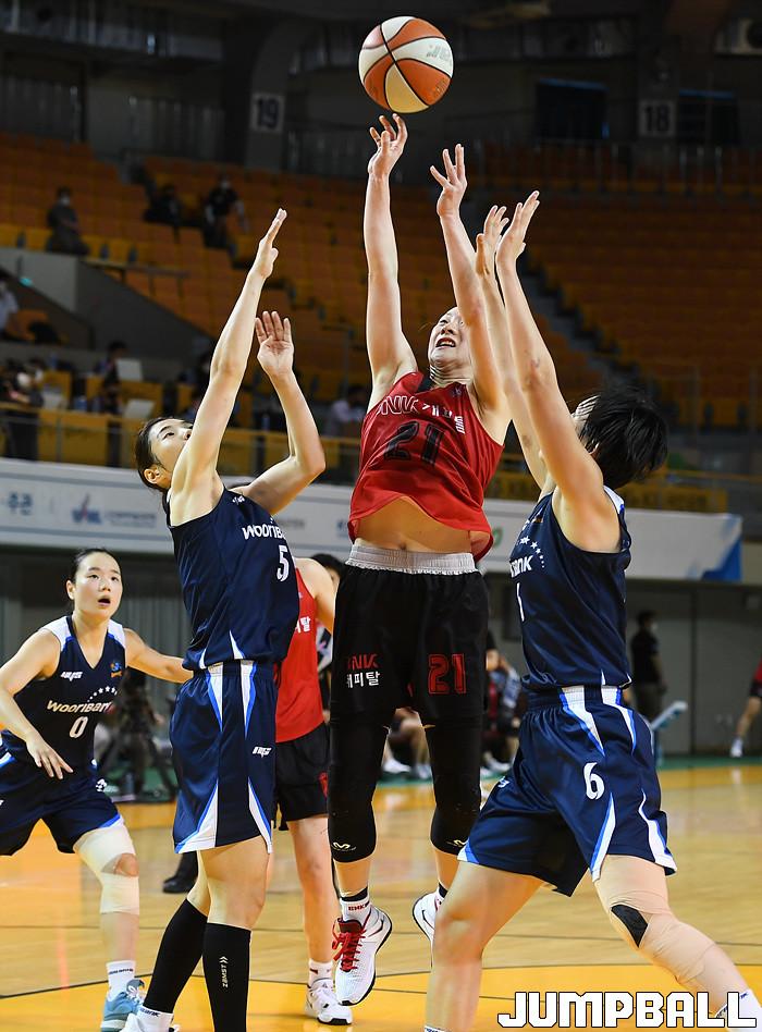 [점프볼=청주/문복주 기자]  16일부터 21일까지 청주체육관에서 '2020 우리은행 박신자컵 서머리그' 우리은행과 BNK썸의 경기, BNK썸 김진영이 두명의 수비를 뚫고 슛을 시도하고 있다.
