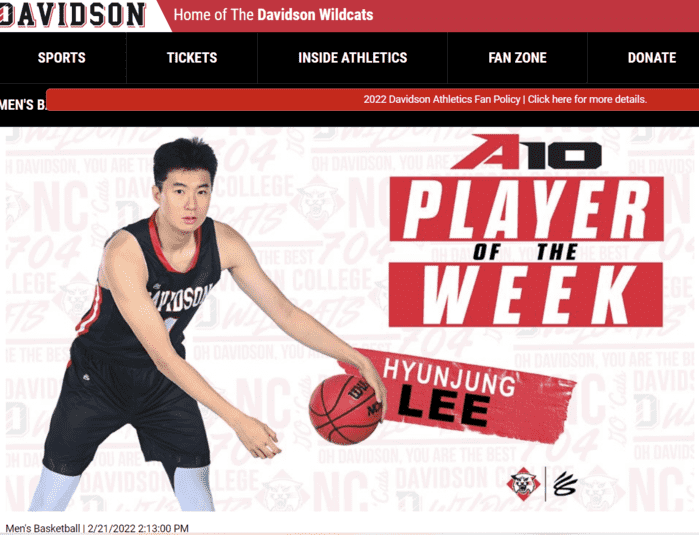 데이비슨대학은 22일(한국시간) 공식 홈페이지를 통해 이현중의 NCAA 1부리그 A-10 컨퍼런스 이주의 선수 선정 소식을 전했다.