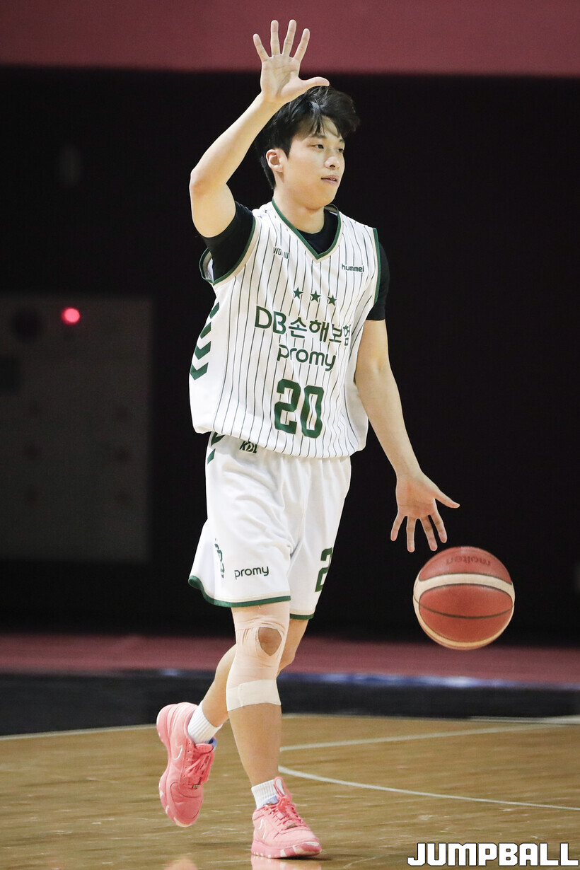 [점프볼=용인/양윤서 인터넷기자] 10일 경희대학교 국제캠퍼스 선승관에서 열린 2025-2026 KBL D리그 수원 KT와 원주 DB의 경기, DB 김휴범이 동료들에게 작전을 지시하고 있다.