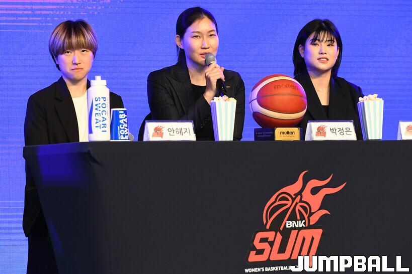 6일 여의도 63컨벤션센터 그랜드볼룸에서 열린 신한은행 SOL 2202-2023 여자프로농구 플레이오프 미디어데이, BNK 박정은 감독이 출사표를 밝히고 있다.