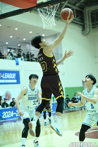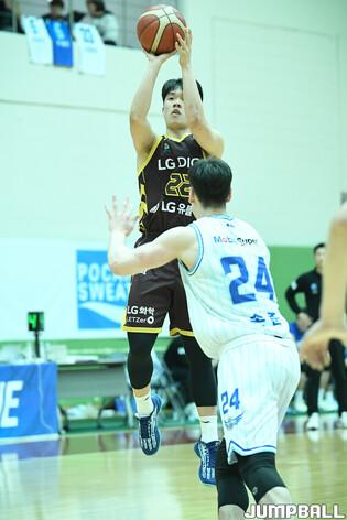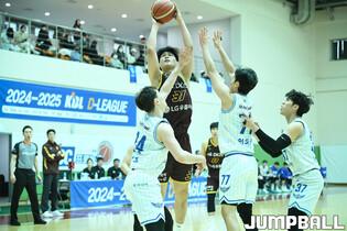[점프볼=이천/유용우 기자] 14일 이천LG챔피언스파크에서 열린 2024-2025 KBL D리그 대구 한국가스공사와 창원 LG의 경기, 한국가스공사 손준이 슛을 던지고 있다.