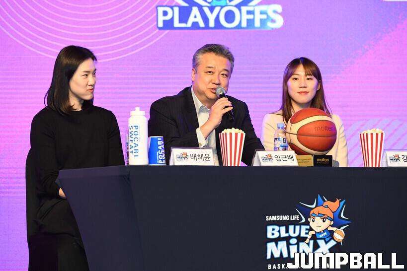 6일 여의도 63컨벤션센터 그랜드볼룸에서 열린 신한은행 SOL 2202-2023 여자프로농구 플레이오프 미디어데이, 삼성생명 임근배 감독이 플레이오프를 향한 출사표를 던지고 있다.