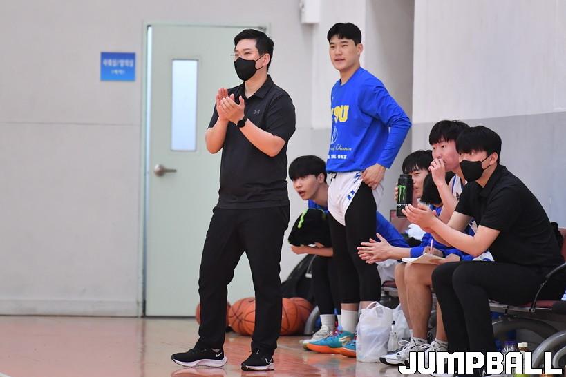 27일 서울 동국대 실내체육관에서 열린 2022 KUSF 대학농구 U-리그 동국대와 조선대의 경기, 조선대 강양현 감독이 코트 위 선수들을 향해 박수를 쳐주고 있다.