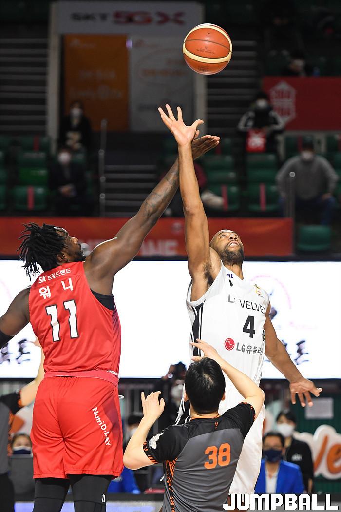 [점프볼=잠실학생/박상혁 기자] 1일 잠실학생체육관에서 열린 2020-2021 현대모비스 프로농구 서울 SK와 창원 LG의 경기, 점프볼로 경기가 시작되었다.