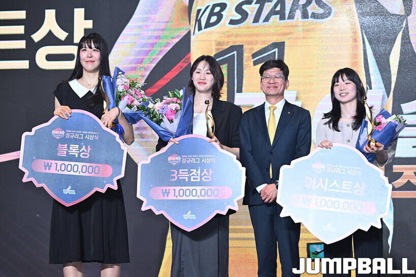 홀 3층에서 260406 BNK금융 2025-2026 여자프로농구 정규리그 시상식, 블록상 KB스타즈 박지수, 3점야투상(3점슛 성공률) KB스타즈 강이슬,어시스트상 KB스타즈 허예은이 수상을 했다.