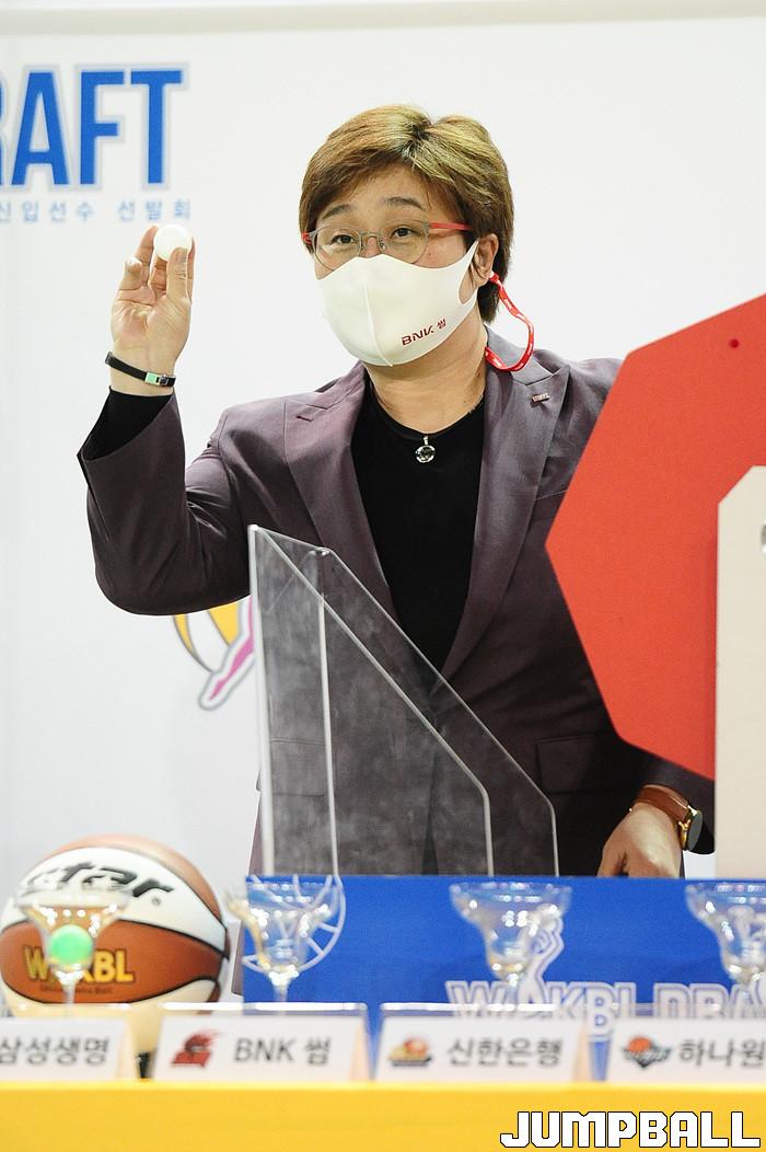 [점프볼=청주/박상혁 기자] 4일 청주실내체육관에서 열린 2020-2021 WKBL 신입선수 선발회, BNK 유영주 감독이 하얀색 구슬을 들고 있다.
