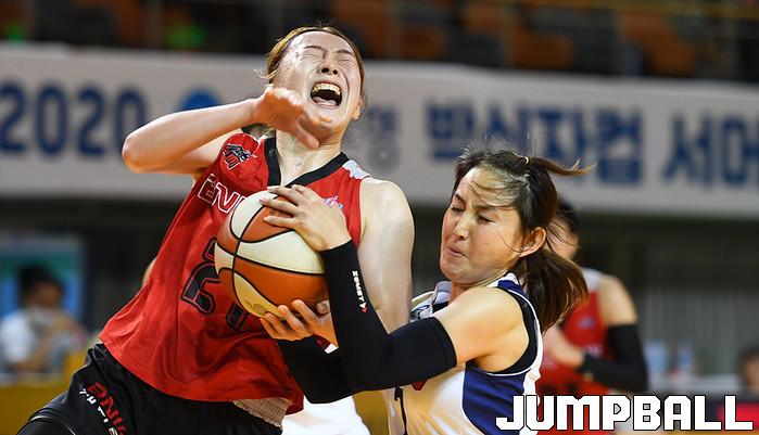 [점프볼=청주/문복주 기자] 17일 청주체육관에서 열린 '2020 우리은행 박신자컵 서머리그' 대구시청과 BNK썸의 경기, 대구시청 김은경이 BNK썸 김진영의 볼을 가로채고 있다.