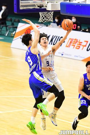 [점프볼=수원/박상혁 기자] 25일 서수원칠보체육관에서 열린 2021 KUSF 대학농구 U-리그 연세대와 명지대의 경기, 연세대 은희석 감독이 김동현에게 지시를 내리고 있다.