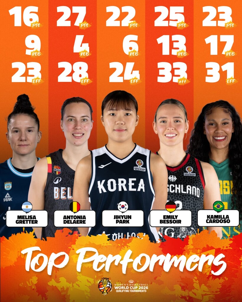 FIBA(국제농구연맹)는 13일(한국시간) 공식 홈페이지를 통해 2026 FIBA 여자농구 월드컵 최종예선 탑 퍼포머스 5인을 공개했다. 13일 열렸던 경기를 기준으로 가장 눈에 띄는 활약을 펼친 5명을 꼽았다.