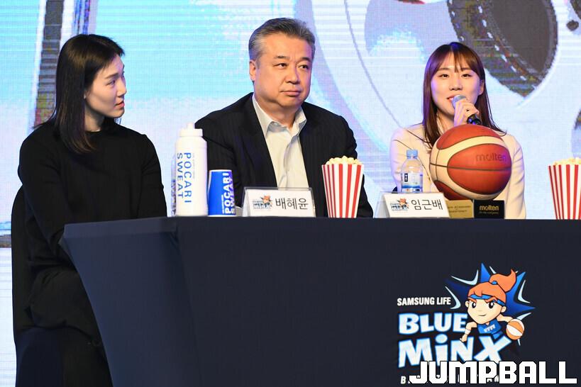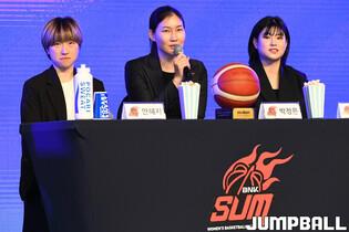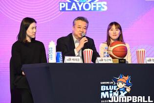 6일 여의도 63컨벤션센터 그랜드볼룸에서 열린 신한은행 SOL 2202-2023 여자프로농구 플레이오프 미디어데이, 삼성생명 강유림이 첫 플레이오프를 향한 각오를 얘기하고 있다.