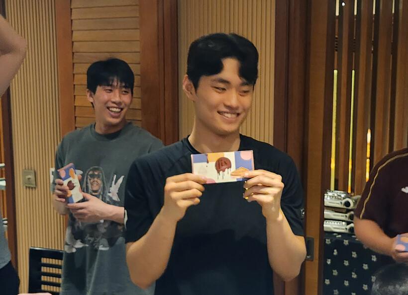 가드 유기상은 “사실 이번 대회 내내 음식으로 고생을 좀 했다”며 “호텔 음식이 입맛에 맞지 않아 차선책으로 인근 쇼핑몰에서 양식 식당을 방문하기도 했다. 출국 전 마지막 날이라 더 뜻깊다. 이렇게 챙겨주시다니 너무 감사하다. 이제야 한식을 원 없이 먹을 수 있게 됐다”고 엄지를 치켜세웠다.