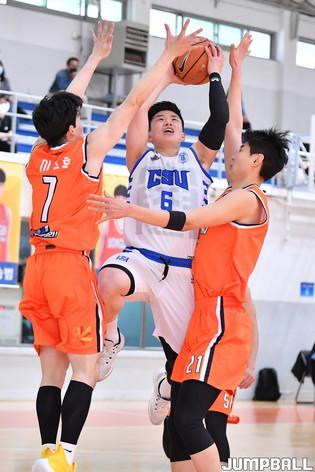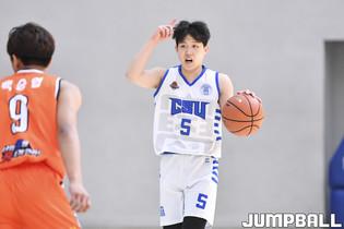 27일 서울 동국대 실내체육관에서 열린 2022 KUSF 대학농구 U-리그 동국대와 조선대의 경기, 조선대 유창석이 빠르게 상대 코트로 드리블치며 넘어오고 있다.