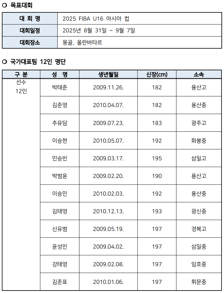대한민국농구협회는 14일 "오는 8월 31일부터 몽골, 울란바타르에서 진행되는 2025 FIBA(국제농구연맹) U16 아시아컵에 출전할 U16 남자대표팀 최종 12인을 붙임과 같이 선발·확정했다"고 밝혔다.