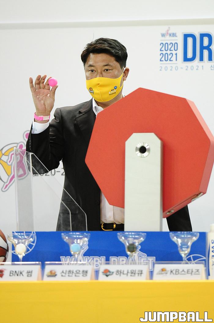 [점프볼=청주/박상혁 기자] 4일 청주실내체육관에서 열린 2020-2021 WKBL 신입선수 선발회, KB스타즈 안덕수 감독이 핑크색 구슬을 들고 있다.