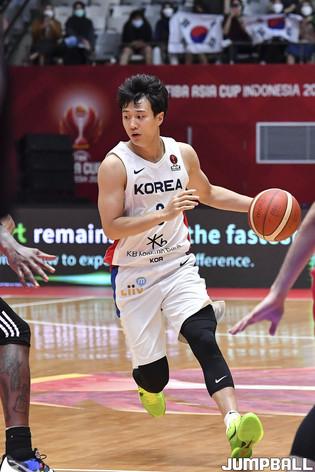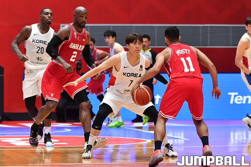 16일 인도네시아 자카르타 이스토라 세네얀에서 열린 FIBA 아시아컵 B조 대한민국과 바레인의 경기. 대표팀 이우석이 상대 가드를 팔을 올려 수비를 하고 있다.